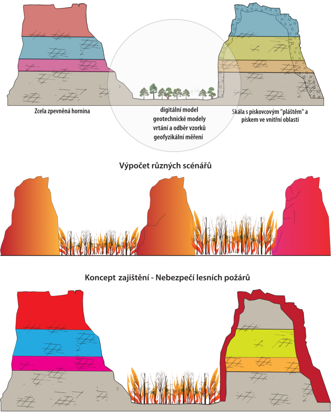 Simulace scénářů ohrožení požáry budou kalibrovány pomocí výsledků ohňových zkoušek. Tepelné zatížení tak bude možné v budoucnu odhadnout bez dalších experimentů. Materiálové změny skal budou modelovány na základě výsledků terénních prací, laboratorních zkoušek a geometrických modelů. Následně jsou simulovány požární scénáře s různými teplotami, aby bylo možné určit tepelné zatížení a možné porušení horniny. Dále bude vypočítán vliv hašení na tvorbu trhlin v hornině a tím na stabilitu.